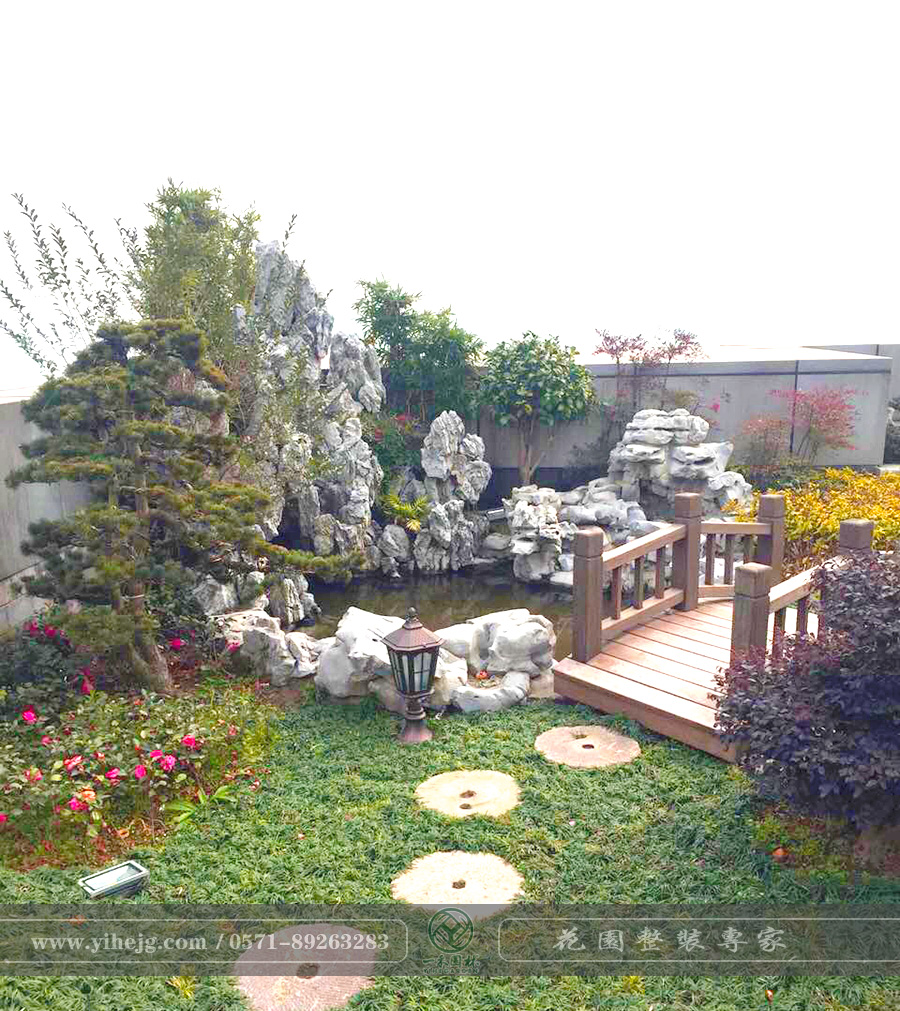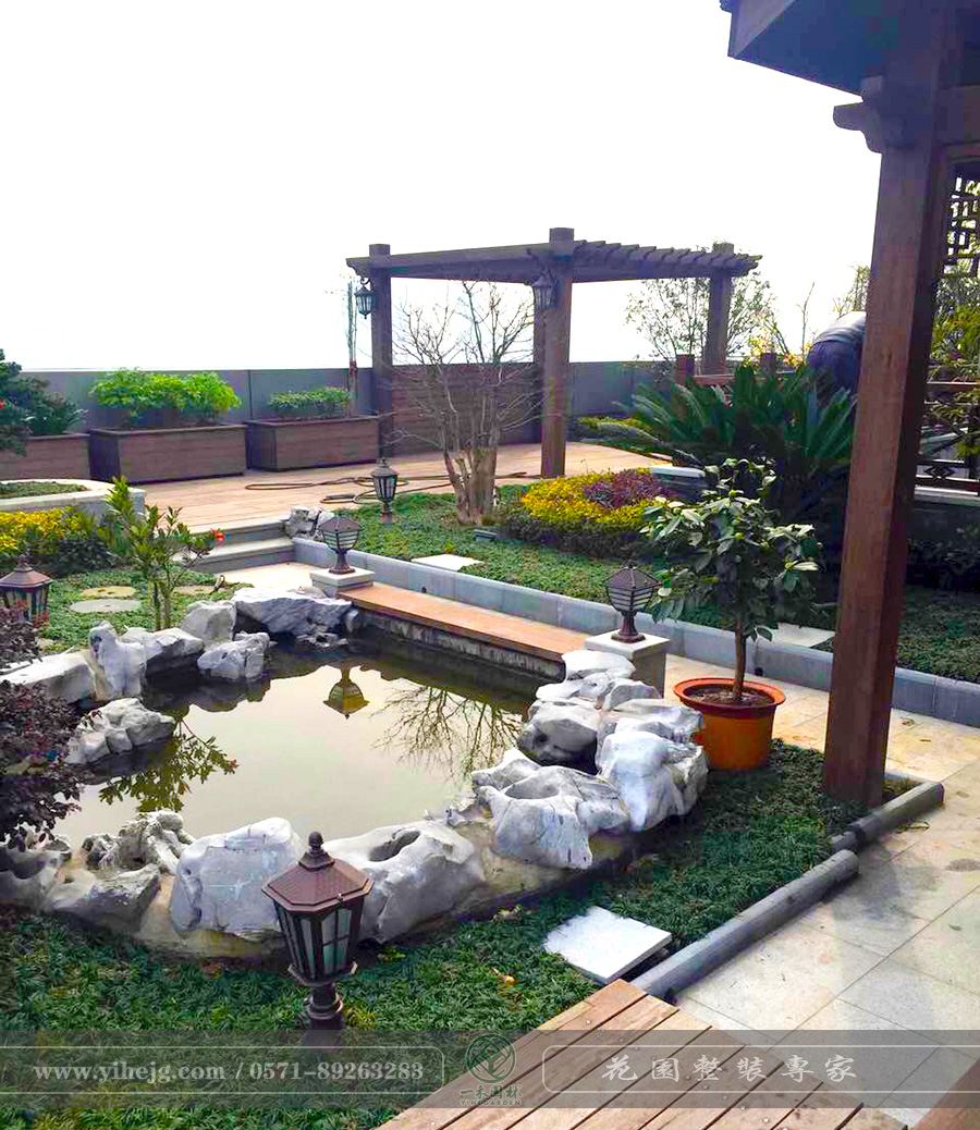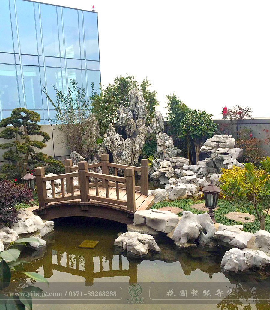 露臺花園|露臺假山水溪景觀|露臺木平臺景觀設計|私家小露臺景觀綠化